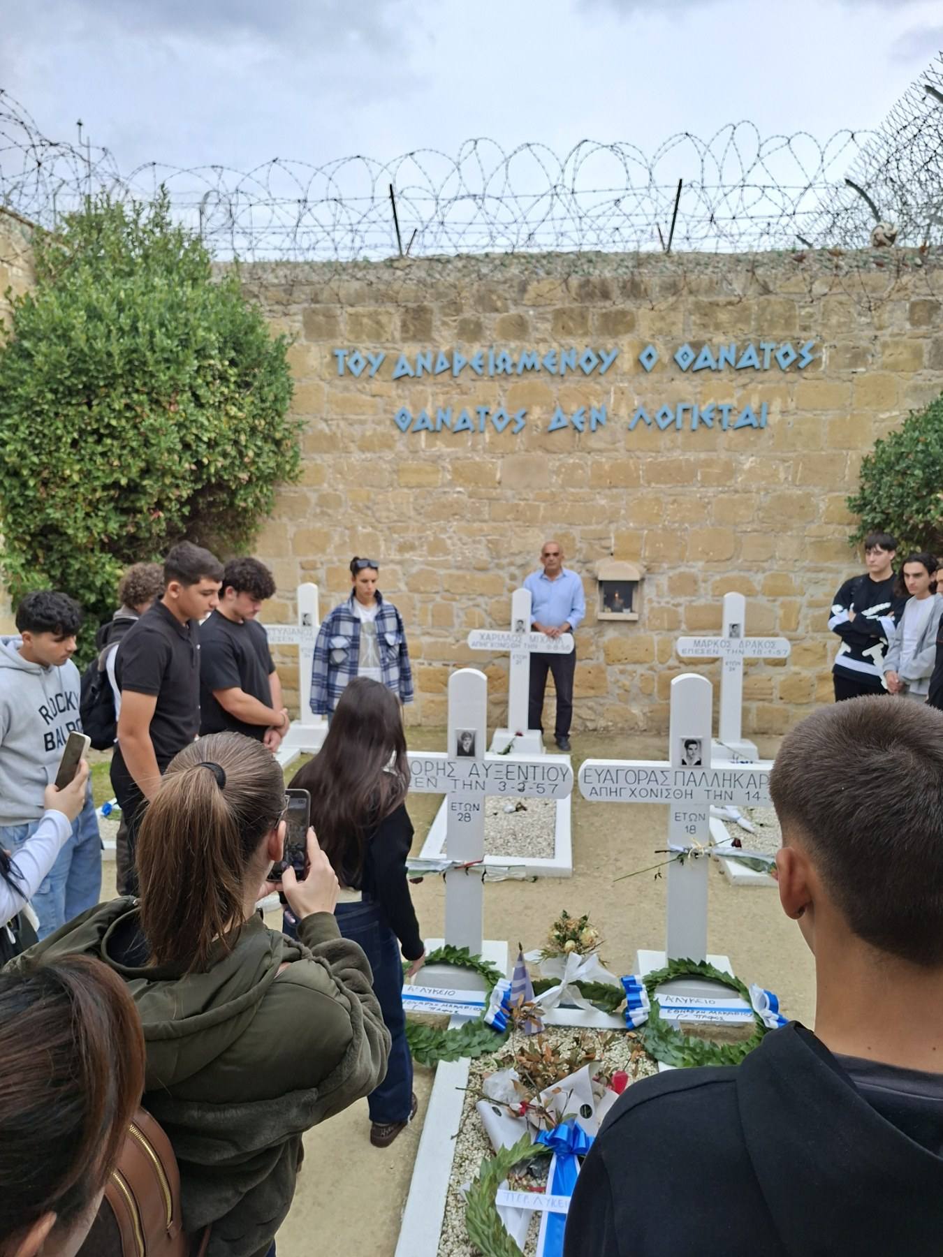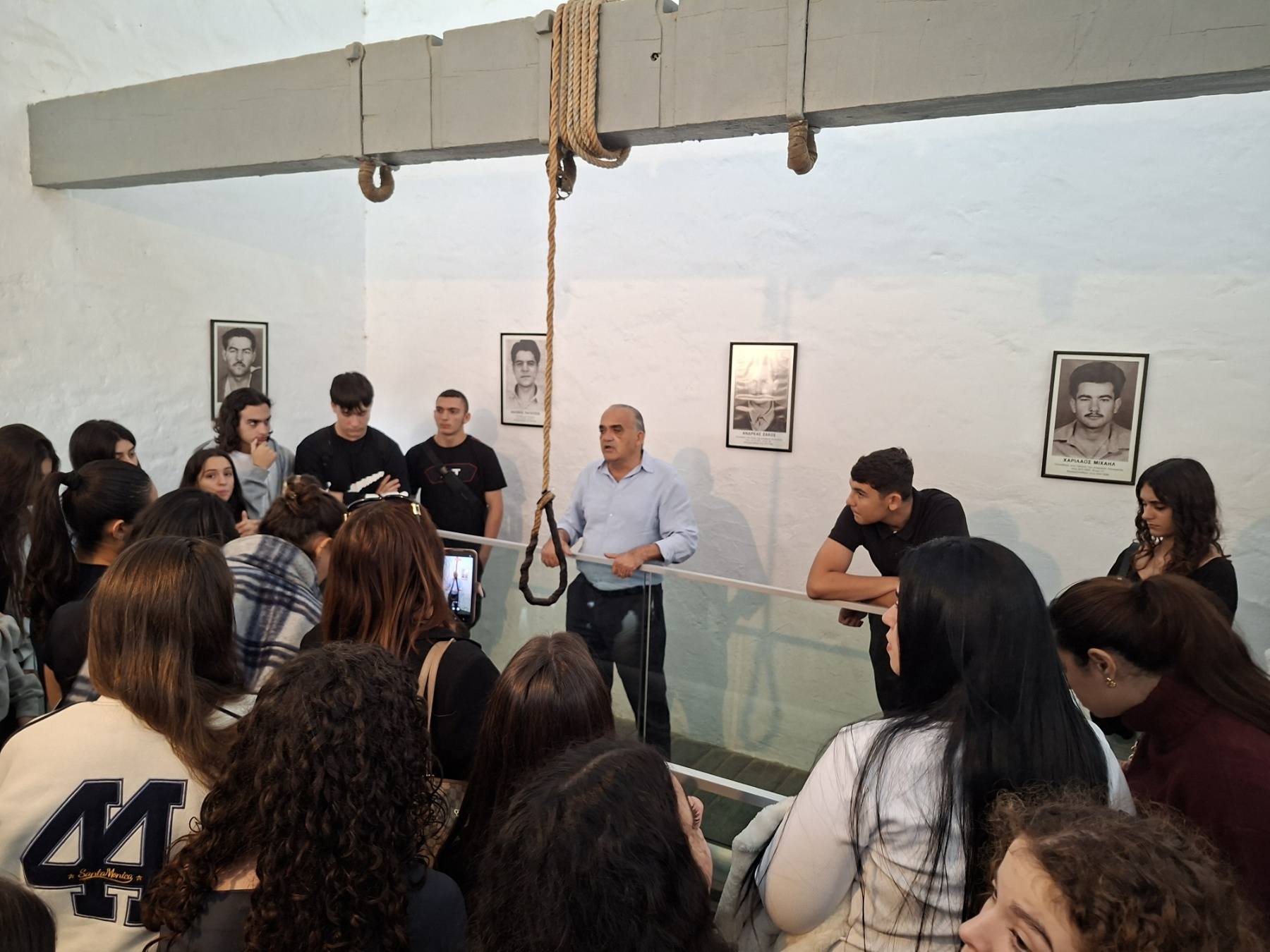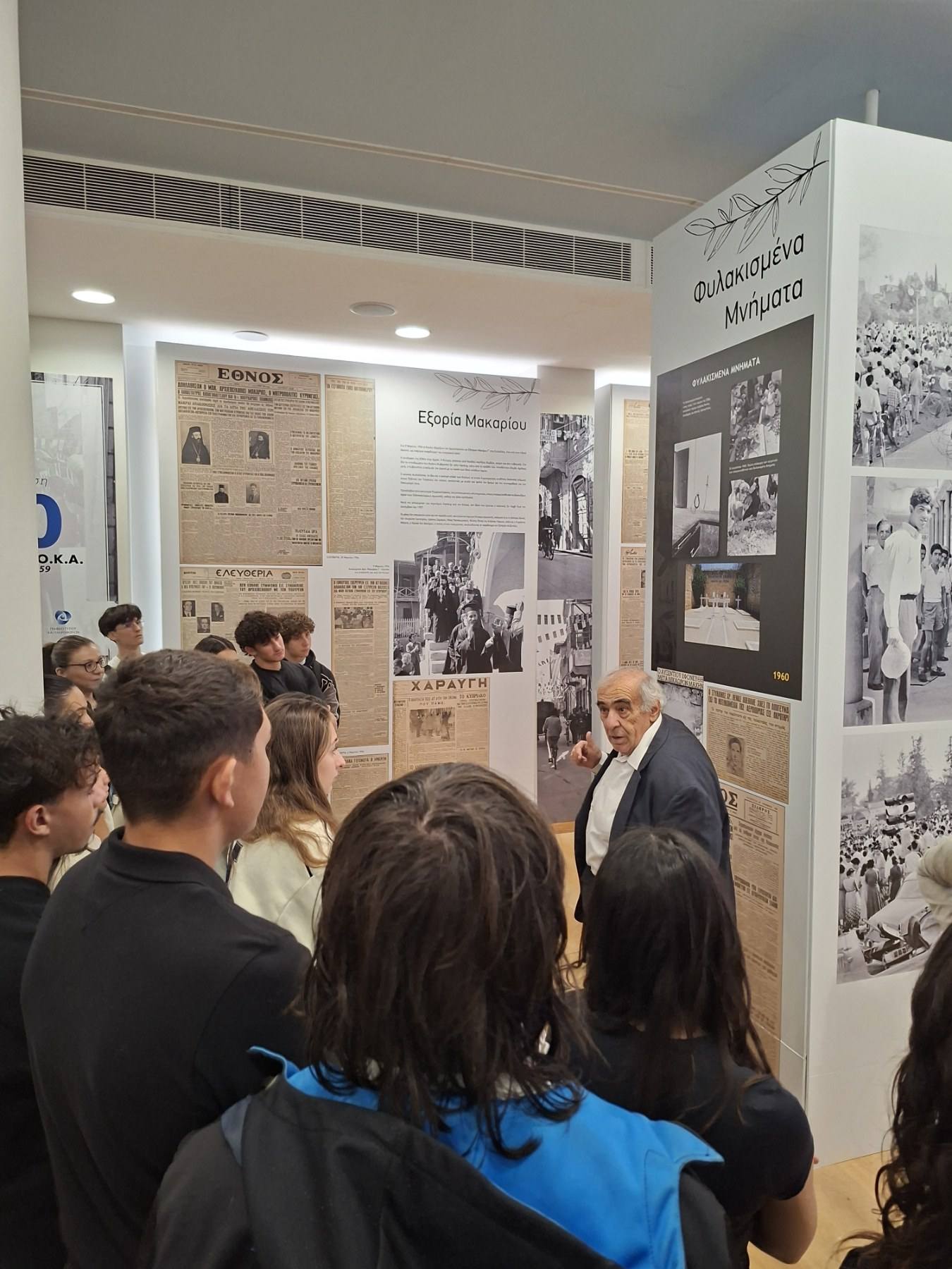 Μια ιδιαίτερα συγκινητική, γεμάτη δέος και εθνική υπερηφάνεια μέρα είχαν σήμερα οι μαθητές των τμημάτων Γ31 και Γ52 κατά τη διάρκεια της επίσκεψής τους στην έκθεση φωτογραφίας που οργανώνεται στο παλιό Δημαρχείο της Λευκωσίας με αφορμή τα 70 χρόνια από το ξέσπασμα του εθνικοαπελευθερωτικού μας αγώνα και στα φυλακισμένα μνήματα. Στην πρώτη ξενάγηση οι μαθητές είχαν την ευκαιρία να ακούσουν τις μαρτυρίες και να συνομιλήσουν με τον Ανδρέα Οικονόμου, αγωνιστή της ΕΟΚΑ, καθώς και με τον Αριστείδη Παναγίδη, γιο του απαγχονισθέντα αγωνιστή Ανδρέα Παναγίδη. Αργότερα είδαν από κοντά τους χώρους κράτησης και εκτέλεσης των ηρώων μας και κατέθεσαν στεφάνια στο μνήμα του μαθητή του Σχολείου μας, Ευαγόρα Παλληκαρίδη και του Γρηγόρη Αυξεντίου.