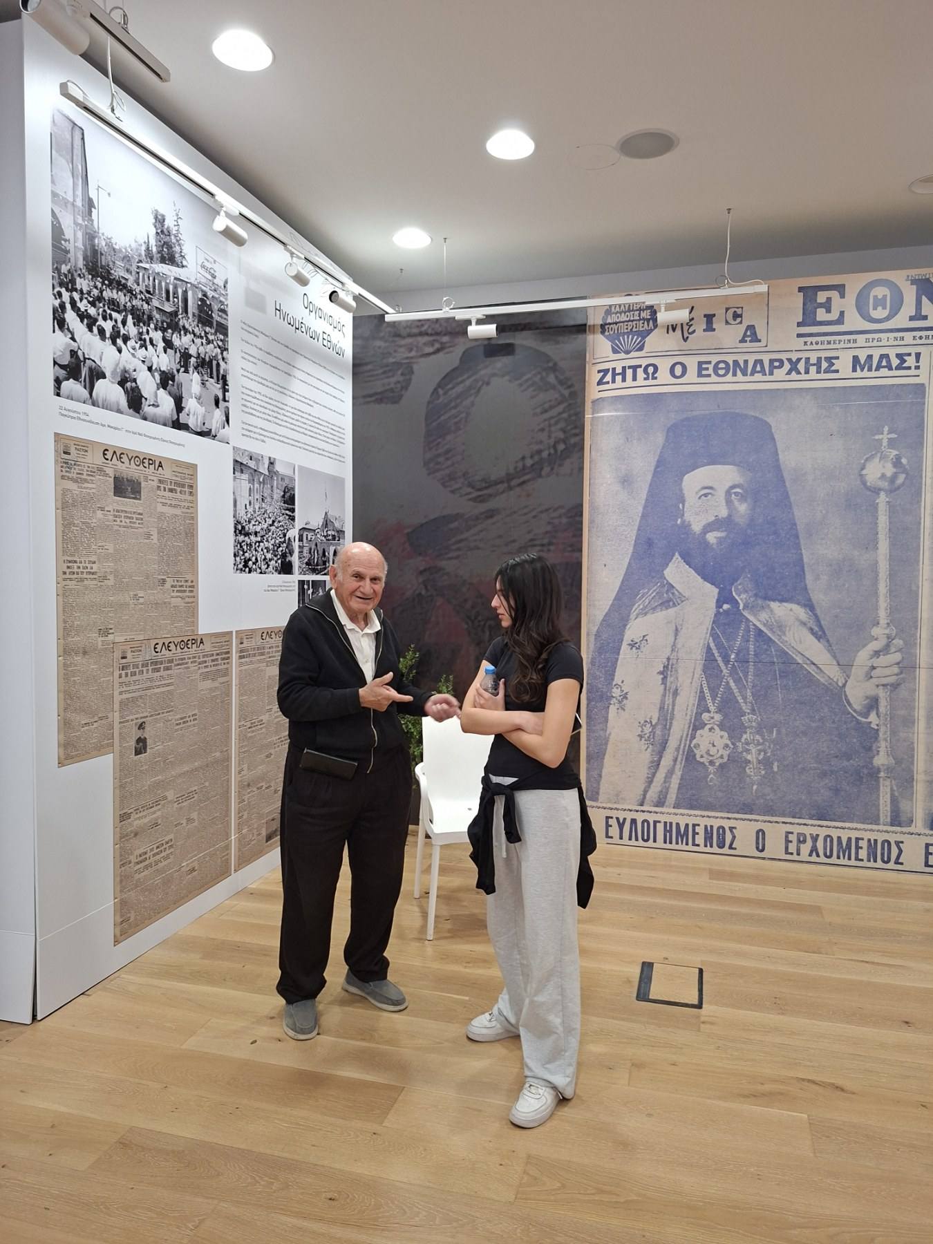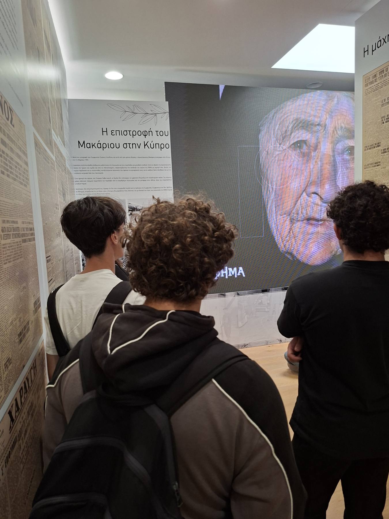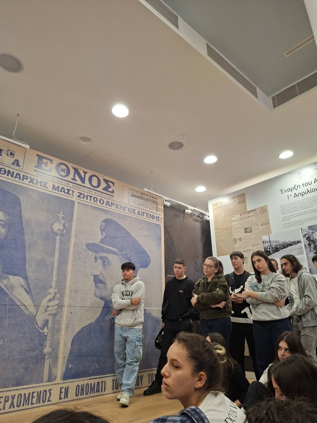 Μια ιδιαίτερα συγκινητική, γεμάτη δέος και εθνική υπερηφάνεια μέρα είχαν σήμερα οι μαθητές των τμημάτων Γ31 και Γ52 κατά τη διάρκεια της επίσκεψής τους στην έκθεση φωτογραφίας που οργανώνεται στο παλιό Δημαρχείο της Λευκωσίας με αφορμή τα 70 χρόνια από το ξέσπασμα του εθνικοαπελευθερωτικού μας αγώνα και στα φυλακισμένα μνήματα. Στην πρώτη ξενάγηση οι μαθητές είχαν την ευκαιρία να ακούσουν τις μαρτυρίες και να συνομιλήσουν με τον Ανδρέα Οικονόμου, αγωνιστή της ΕΟΚΑ, καθώς και με τον Αριστείδη Παναγίδη, γιο του απαγχονισθέντα αγωνιστή Ανδρέα Παναγίδη. Αργότερα είδαν από κοντά τους χώρους κράτησης και εκτέλεσης των ηρώων μας και κατέθεσαν στεφάνια στο μνήμα του μαθητή του Σχολείου μας, Ευαγόρα Παλληκαρίδη και του Γρηγόρη Αυξεντίου.