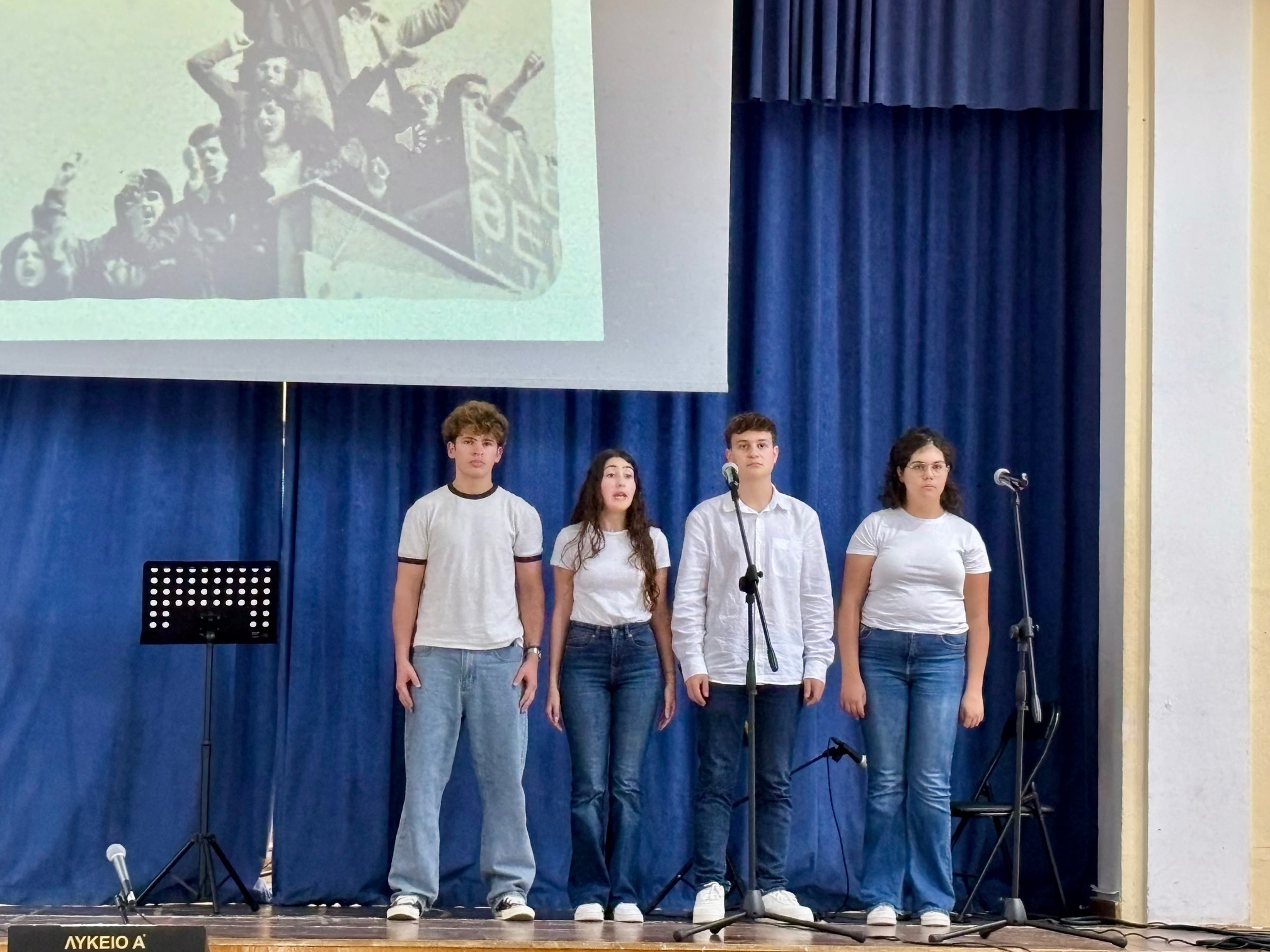 Το σχολείο μας τίμησε την Επέτειο του Πολυτεχνείου με μια όμορφη εκδήλωση, στην οποία οι μαθητές παρακολούθησαν καλλιτεχνικό πρόγραμμα αφιερωμένο στα γεγονότα του 1973.